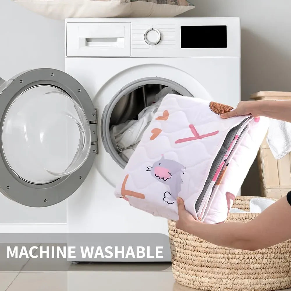 I ordered this Bunnikins & Clover Baby Play Mat in the 71"x59" size, in the Moon & Stars print, which has a gray background with white stars and white crescent moons. I like this print because it doesn't scream "baby." That, and its neutral color scheme make it versatile in its range possible uses. It is quilted with a flat layer of batting between the cotton top layer and the bottom layer which has the rubber non-slip dots all over it. There isn't enough batting to make this mat fluffy like a comforter, but it feels nice and thick. The quality of workmanship is high, as evidenced by inspecting the seams, etc. I could use this mat as a loveseat/daybed protector, a washable floor mat for adults or children, a car seat or car surface protector/pad for pets or kids, an outdoor lounge bed cover when people want a clean, laundered surface to rest on, an outdoor bench throw cover to sit on, a picnic blanket, etc. It's so nice because it's non-slip, yet soft to the touch on the surface! I would definitely recommend this attractive play mat as a very useful baby gift, but I'd also recommend buying it to have on hand as a really useful household item whether you have young children or not. It is of high quality, it's attractive, and it's potential uses are many!